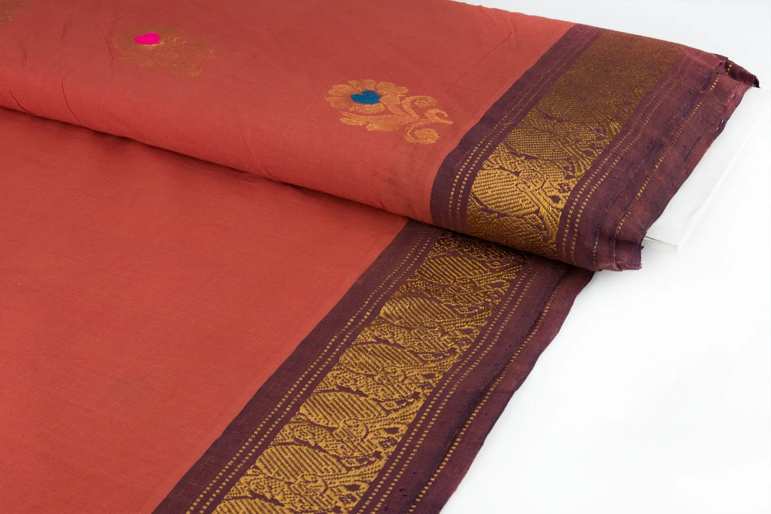 This handloom zari border fabric features a primary background in rust brown, decorated with large, beautiful zari floral motifs. The brown zari border, decorated with a row of peacocks, complements the main color, creating a harmonious and visually appea